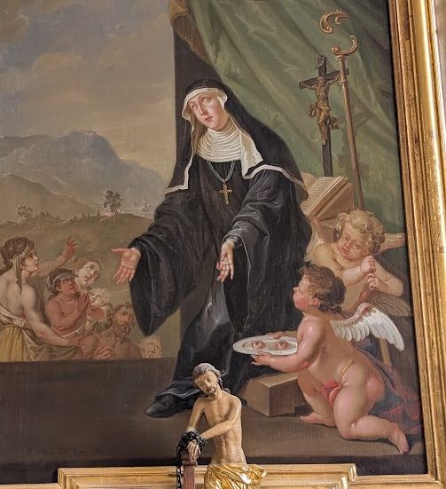 « Patronne de l'Alsace depuis 1946, Ste Odile a été canonisée en 1049 par le Pape Léon IX. Selon la légende, fille du Duc d'Alsace, elle serait née vers 662 à Obernai et se serait éteinte vers 720 en l'abbaye de Hohenbourg » .
